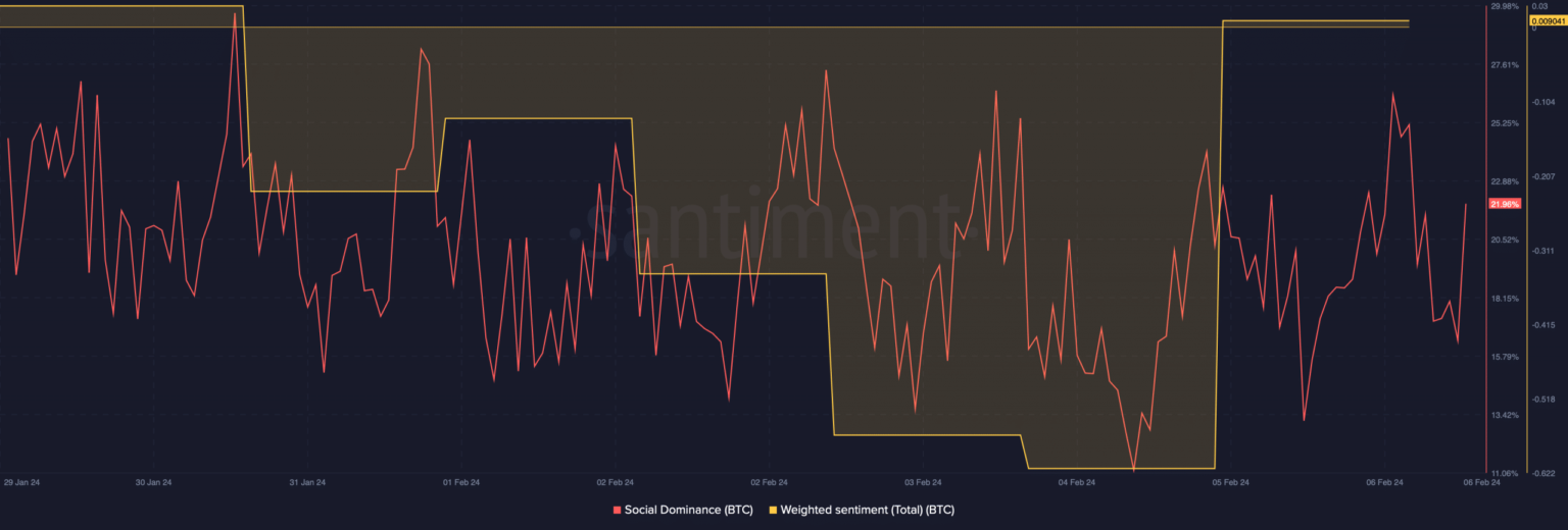 At the time of writing, BTC was trading at $42,708.51 with a market cap of over 483.7 billion. This bearish price action kept Bitcoin’s social dominance high over the past week.