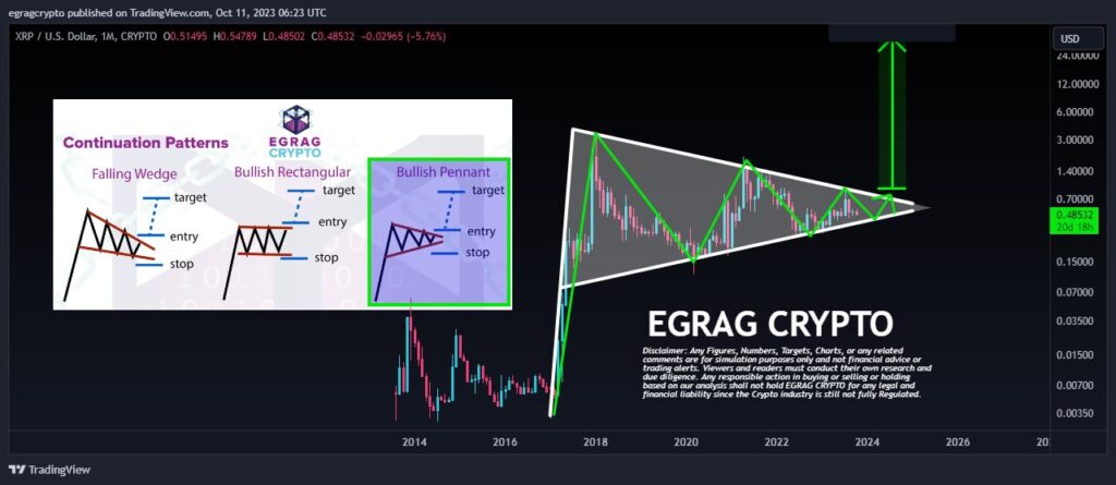 On the monthly XRP/USD chart, Egrag took to Twitter to share his insights, saying: “XRP Monthly Bullish Pennant – Super Bullish Sign: Are you spotting the pattern like I am? It’s incredibly bullish!” According to Egrag, trading on a monthly time frame reduces the chance of false signals.