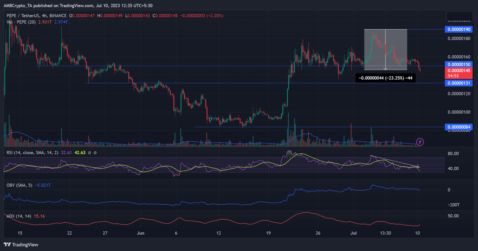 Bitcoin [BTC] hovered above $30,000 for about 19 days since June 21. BTC’s extensive consolidation and fluctuations have led most altcoins to massive pullbacks. In particular, Pepe [PEPE] has lost more than 20% – officially turning the pullback into a downtrend.