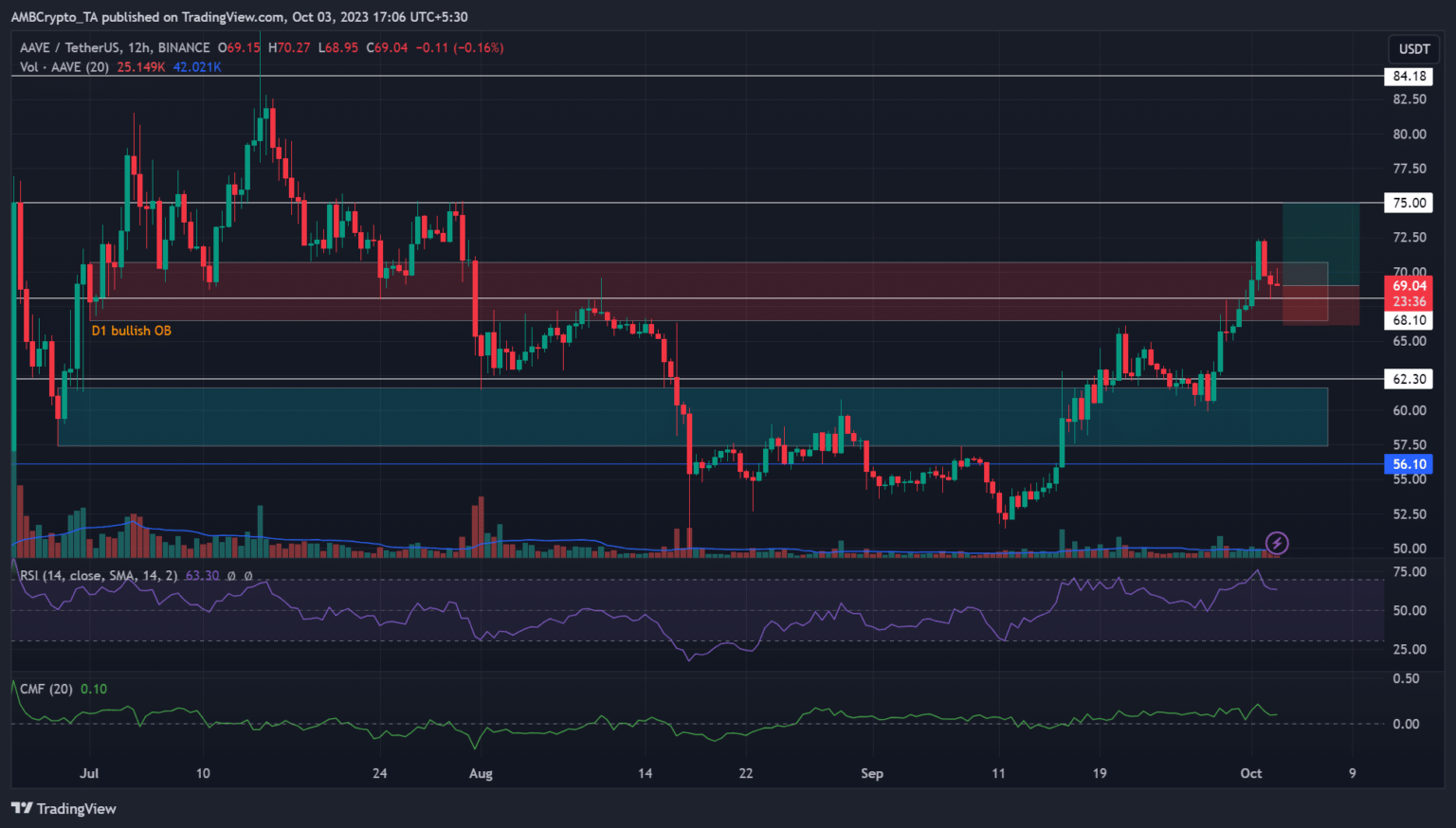 At the time of writing, AAVE has voided a voided daily bullish order block (OB) range of $66.45 – $70.7 (red) and retested a July support zone. If BTC doesn’t post immediate losses, AAVE bulls could defend the support zone.