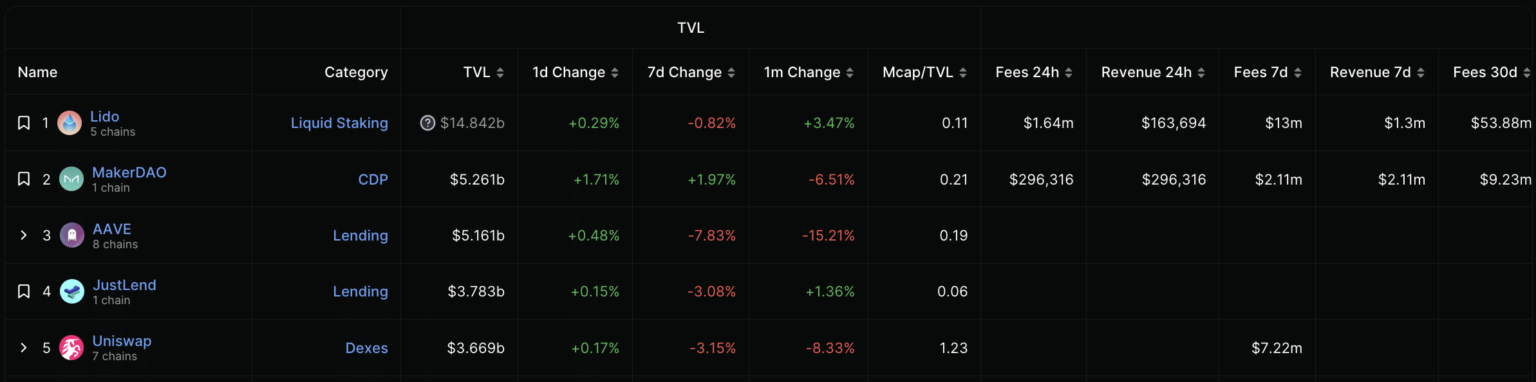 After a 15% drop in total value locked (TVL) over the past week, Aave [AAVE] has been replaced by MakerDAO [MKR] as the decentralized finance protocol (DeFi) with the second largest TVL after Lido Finance [LDO].