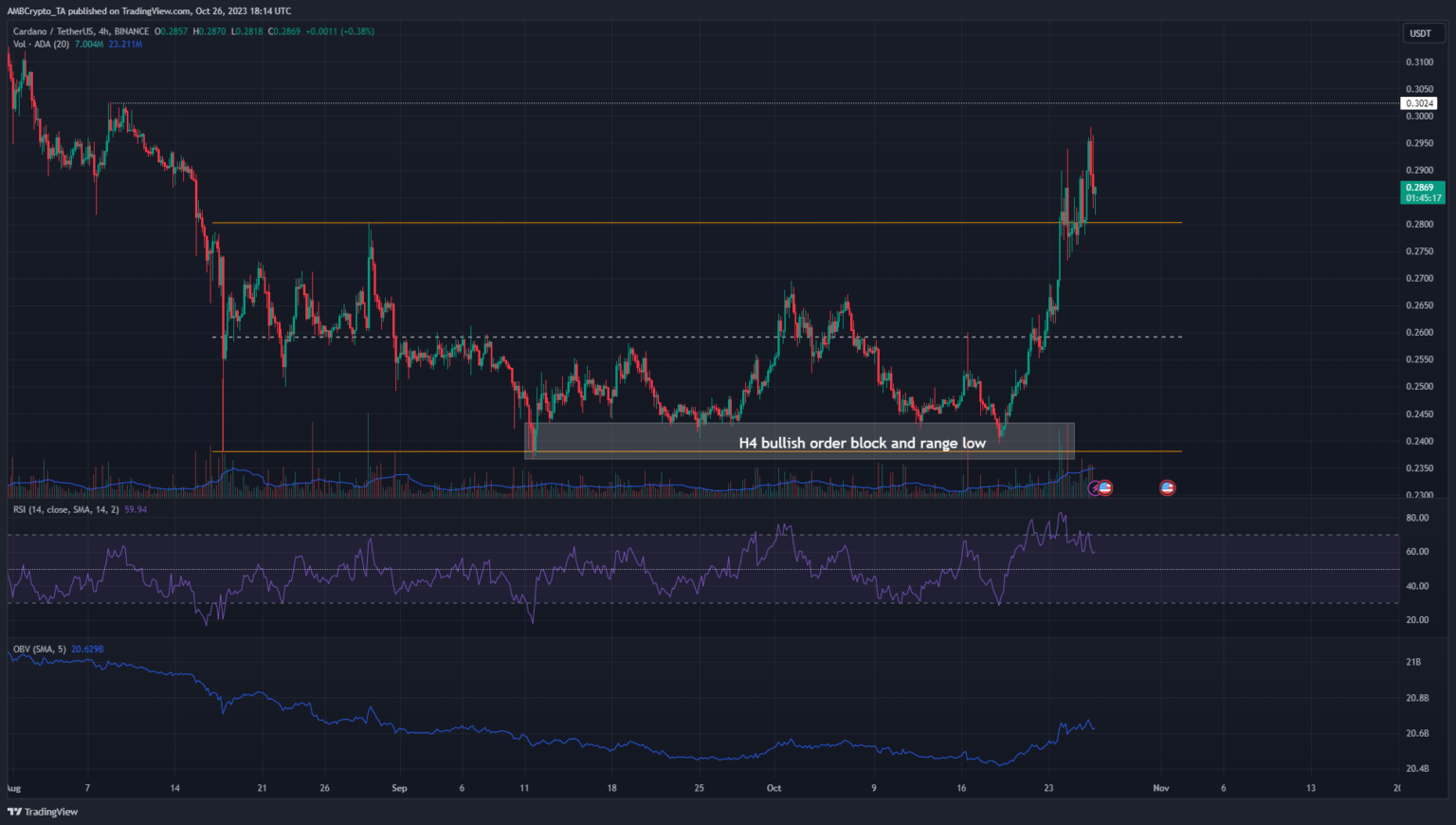 The range (orange) extended from $0.238 to $0.28. On October 24, ADA crossed range highs alongside an uptrend on On-Balance Volume (OBV). The bullish four-hour market structure and rising OBV ensured buying volume was present and supported the price trend.