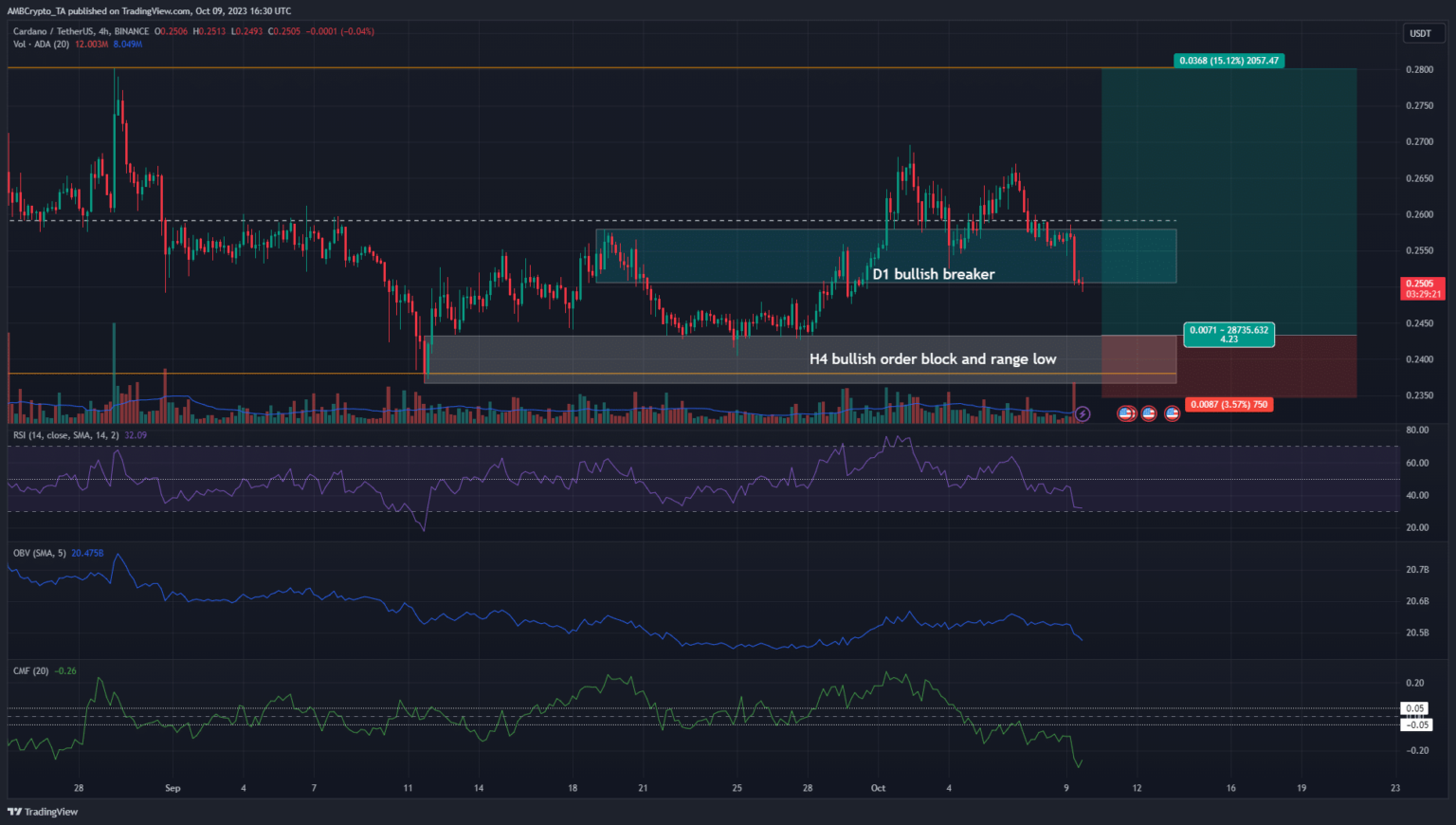 The cyan box at $0.25 was a bullish breaker block on the daily time frame that formed on September 19. At press time, the H4 chart showed that ADA was on the verge of collapse. This would negate the bullish breaker and signal seller dominance.