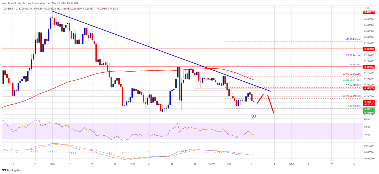 As a result, there was another drop towards the $0.38 support. A low is forming near $0.3800 and the price is showing a few bearish signals, similar to Bitcoin and Ethereum. It is now trading below $0.400 and the 100 simple moving average (4 hours).