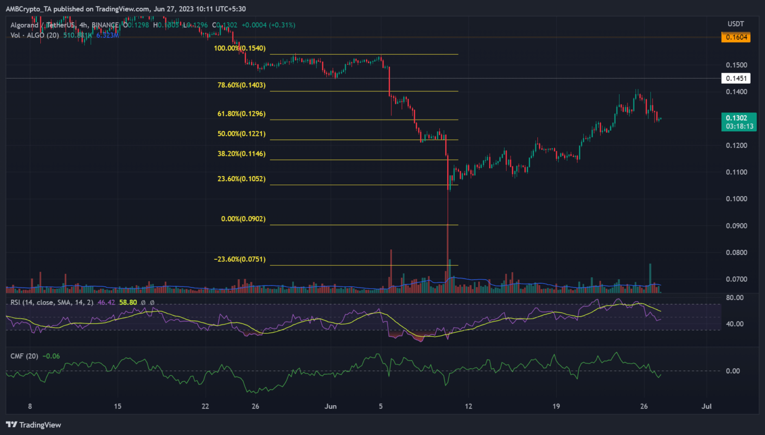 algorithm [ALGO] takes advantage of the prevailing bullish sentiment to recoup recent losses. The token fell from $0.15 to around $0.90 after being categorized as “security” during the SEC lawsuit against Binance [BNB] beginning of June. But it recovered to trade at $0.13 at the time of writing, up about 25% after moving above $0.10 on June 10.