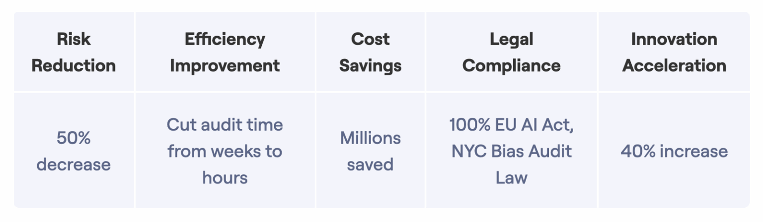 • Bias audit time shortened from 6-8 weeks to 48 hoursdramatic improvement of operational efficiency