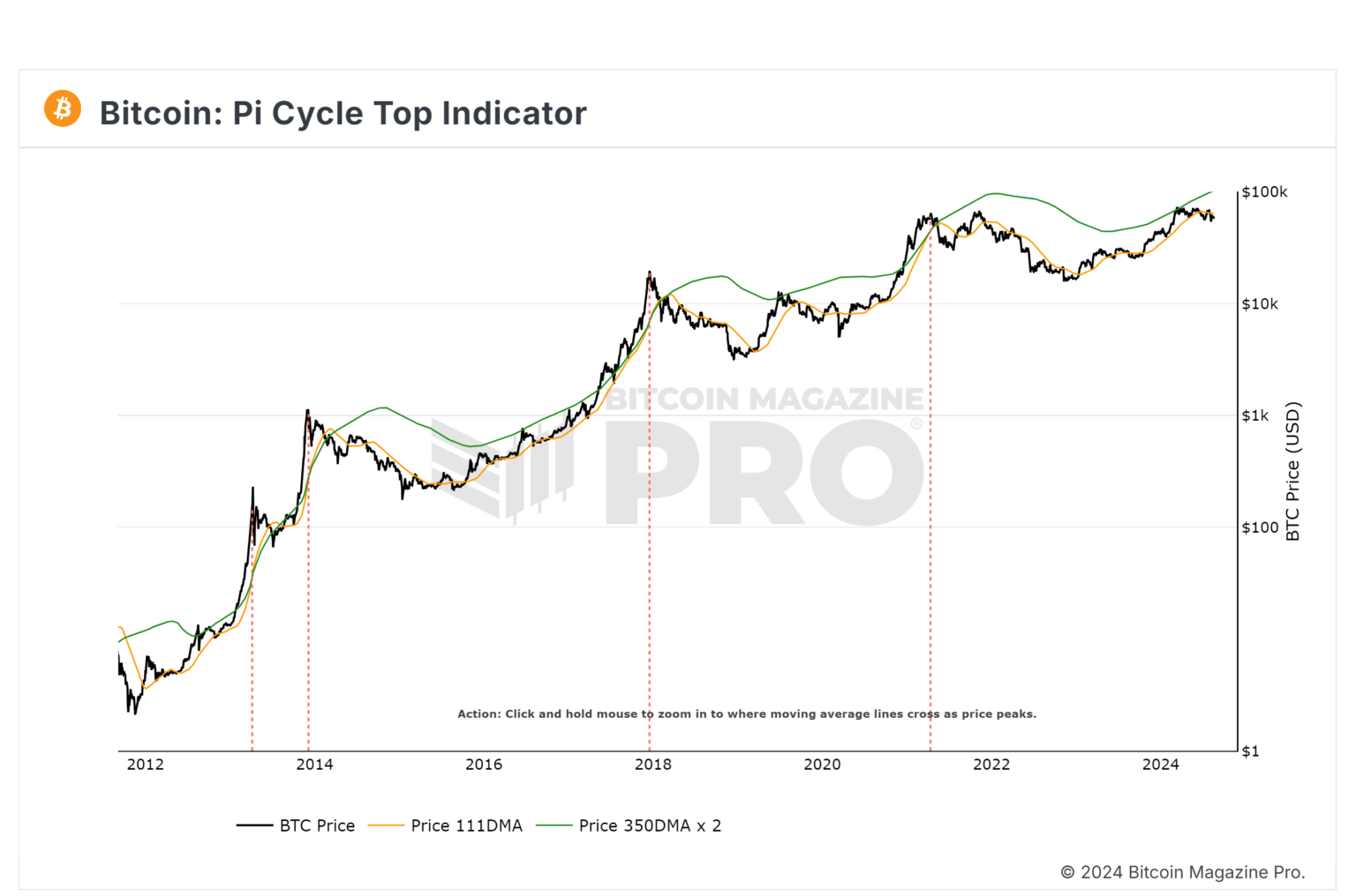 Another element of the PI Cycle Top Indicator is the 350-day moving average. This average is typically revisited at later stages of the market cycle, often acting as resistance before an upward deviation occurs.
