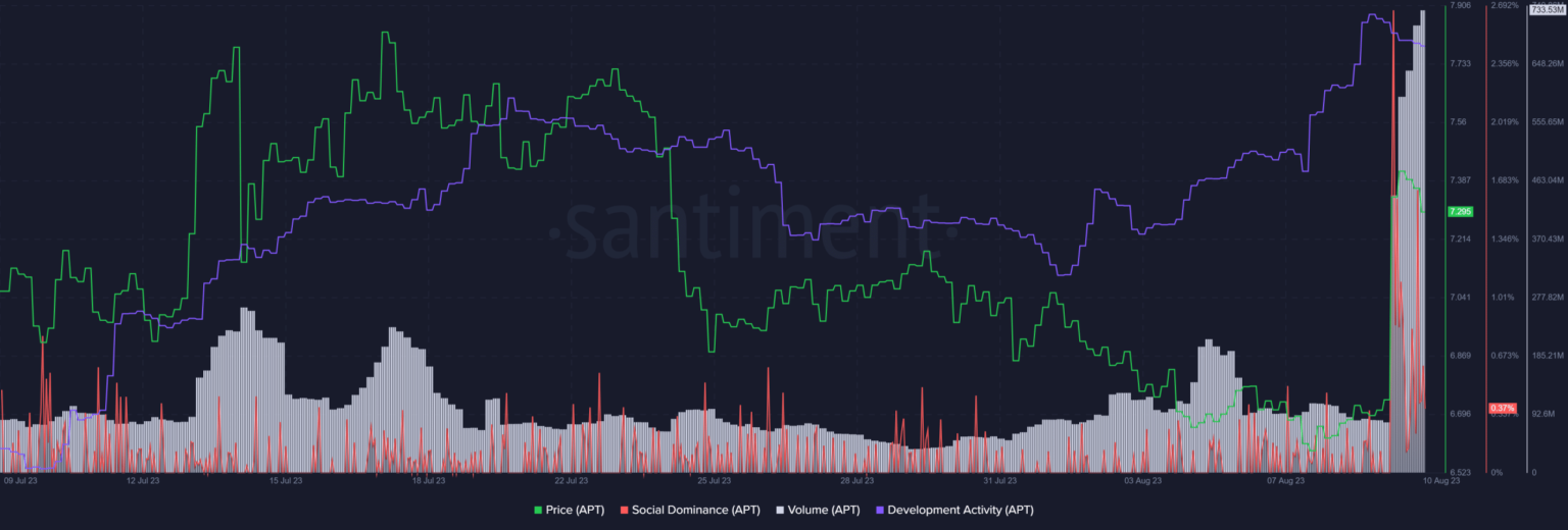According to the Santiment chart, APT’s trading volume rose to over 637 million by the end of August 9. The last time this volume level was reached was around April.