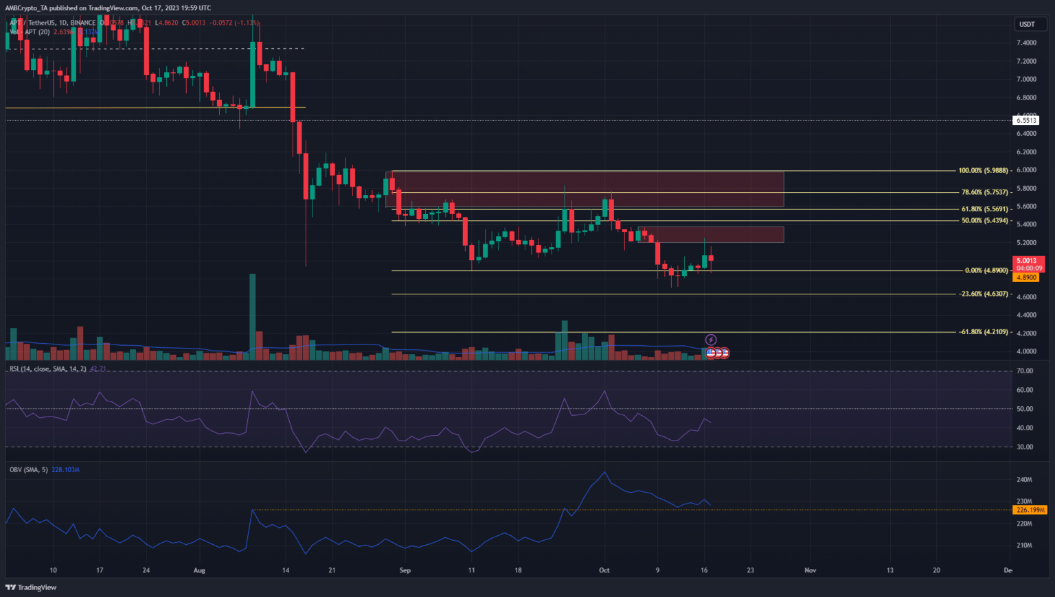 The Open Interest chart has risen since October 9. APT also saw a small increase from $4.7 to $5 starting on October 12th. Together, the OI and price indicated bullish sentiment in the market in the short term.