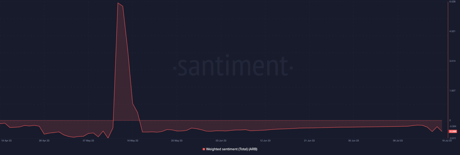 The large number of withdrawals and whale confidence could improve general sentiment around ARB. At the time of writing, ARB’s weighted sentiment was negative, suggesting that the crypto community’s overall view of ARB was pessimistic.