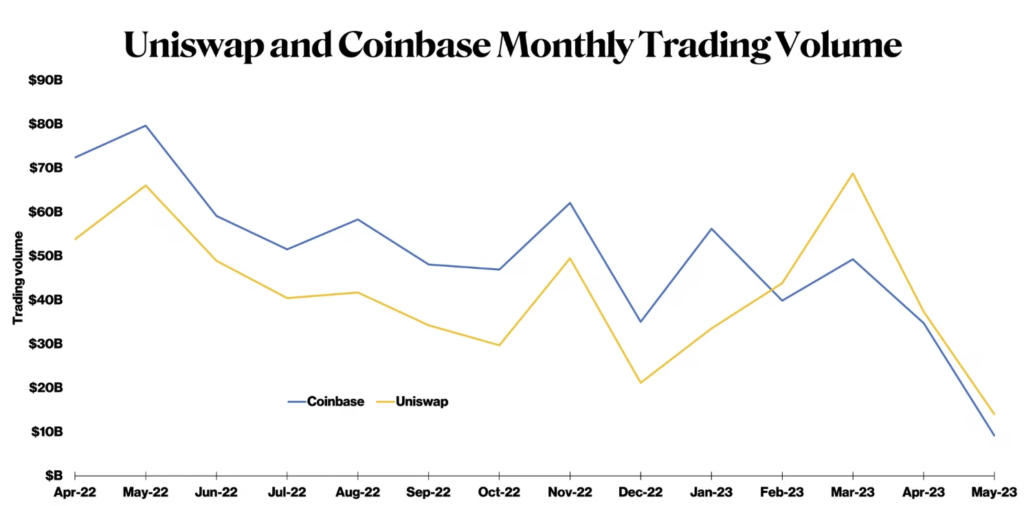 So the fact that UniSwap has surpassed Coinbase in trading volume for four straight months suggests 1 of 2 things: