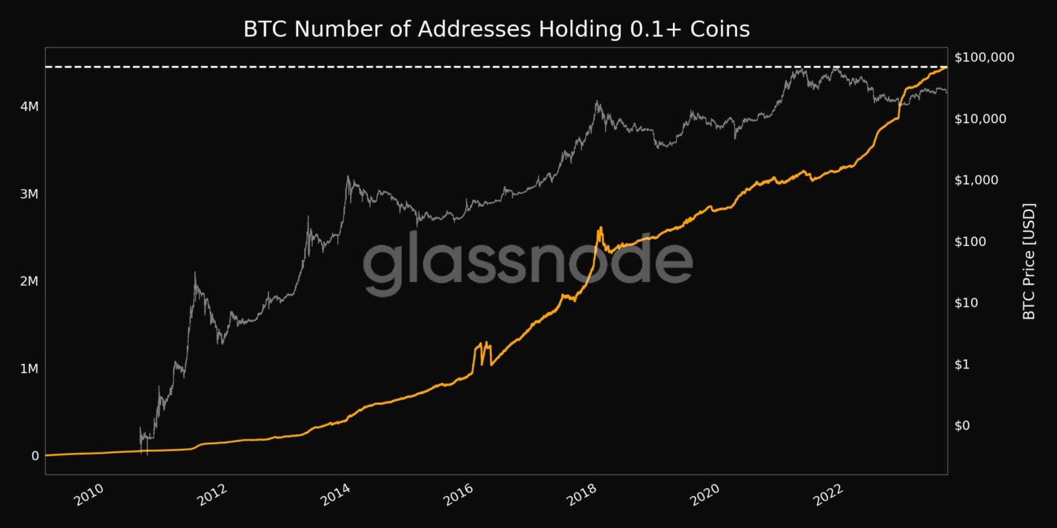 In the midst of this miner dynamic, an intriguing trend persisted. Retail interest in Bitcoin continued to rise. At the time of writing, an important milestone has been reached. A record high of 4,448,542 addresses contained at least 0.1 BTC.