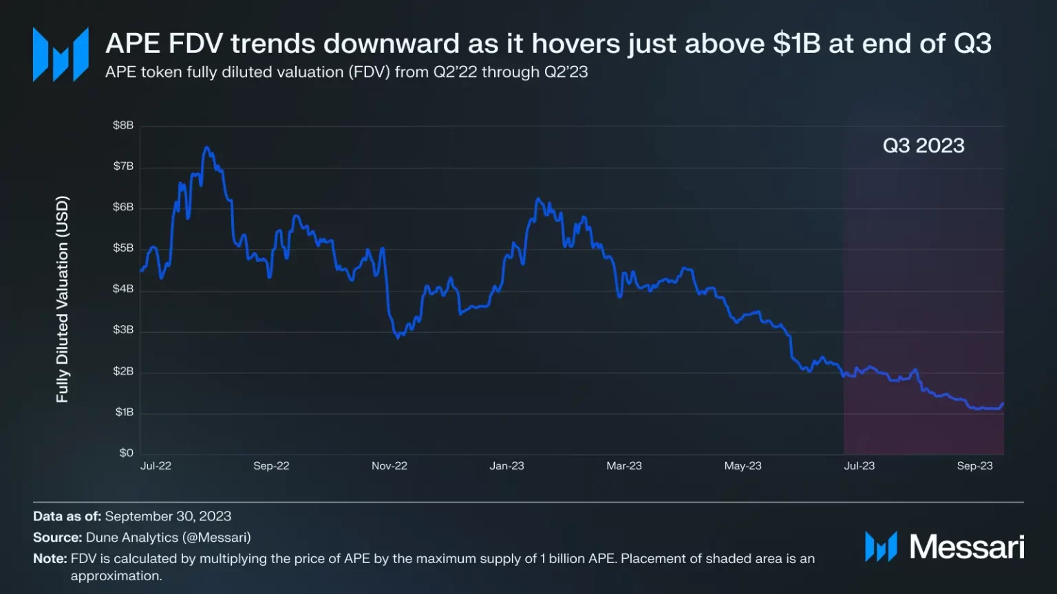 According to Messari, APE’s FDV had fallen to $1.1 billion by mid-September, with average daily FDV falling more than 50% within a 90-day period.