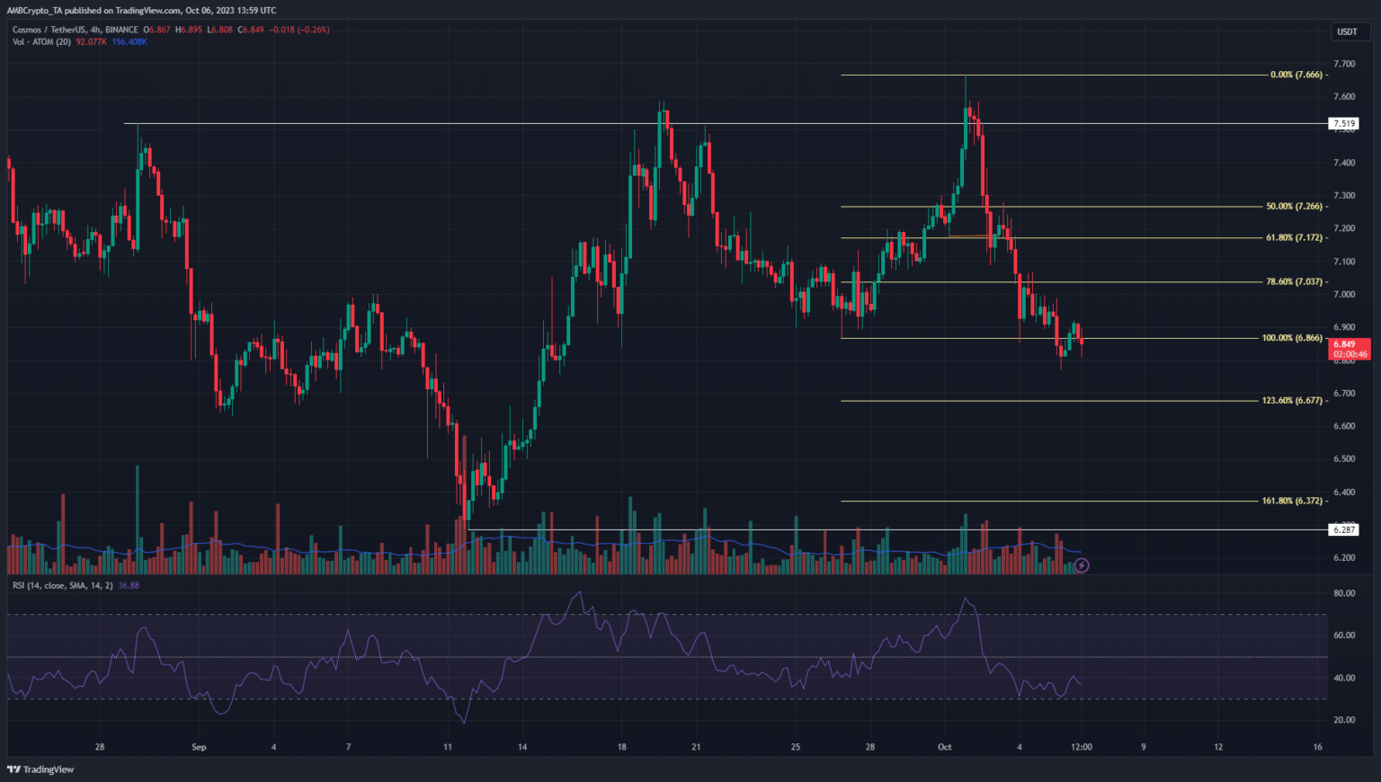 ATOM has wiped out all the gains from the past week, and then some. The Fibonacci levels (light yellow) showed a four-hour trading session closing below $6,866, which was the September 26 low. The drop below the 78.6% retracement meant that ATOM was likely heading further south.
