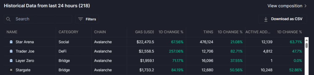 Additionally, active addresses have skyrocketed 63.71% to 12,139 over the past day. Interestingly, Stars Arena contributed to the majority of gas consumption on Avalanche, with $22,470 worth of gas.
