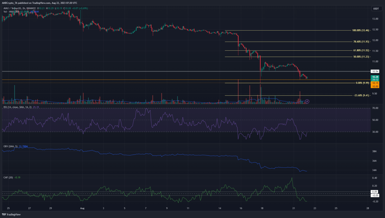 Therefore, the likely path was a retest of the $10.5 resistance before a move to $9.41, the 23.6% extension level. The orange-highlighted levels at $10.15 and $10 were extremely important. They represented the low of 2023 so far and a demand zone in June and July 2021. $10.5 was also critical, and AVAX bulls have not fought hard at these levels.