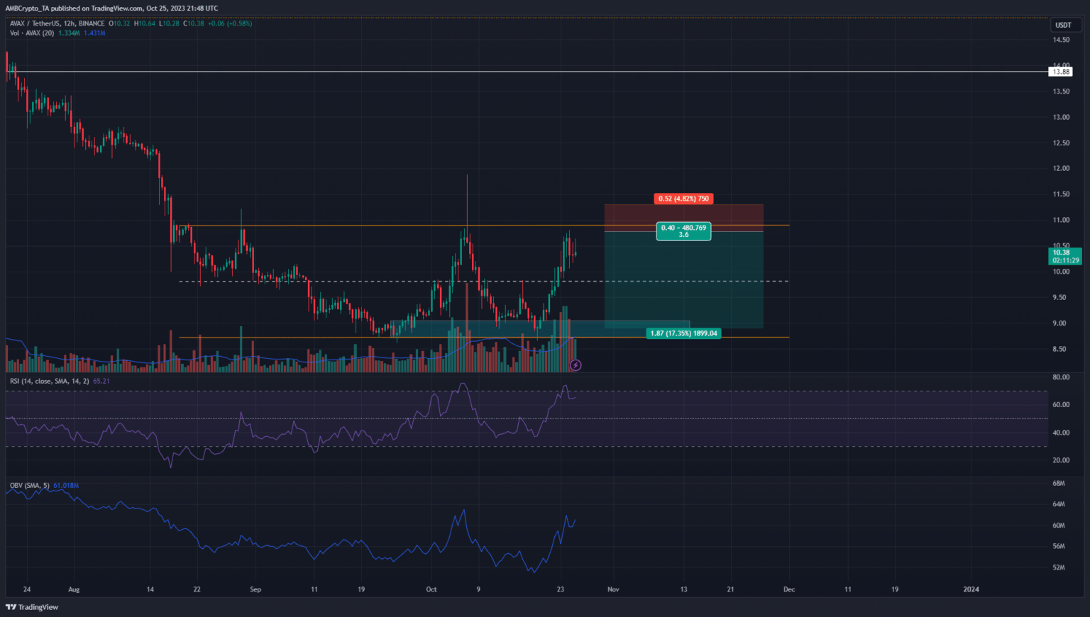 Avalanche [AVAX] saw a strong bullish run over the past six days. The token recorded a gain of almost 25% as it rose from $8.65 to $10.8. During this time, Bitcoin [BTC] also rose by almost 24%.