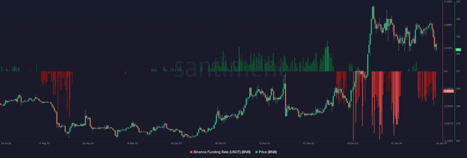 AMBCrypto’s analysis of Binance Coin’s [BNB] The funding rate showed that the currency could be ready for a bounce if history is any guide. Like other cryptocurrencies, BNB suffered a setback when its price dropped from $334 to $291. This dump represents a decline of 6.14% over the past seven days.