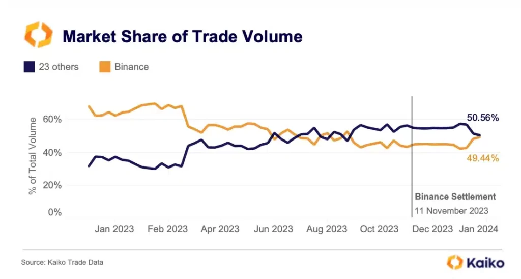 According to leading crypto market researcher Kaiko, Binance’s market share against 23 other centralized exchanges rose to 49% in January, up from multi-year lows in the latter part of 2023.