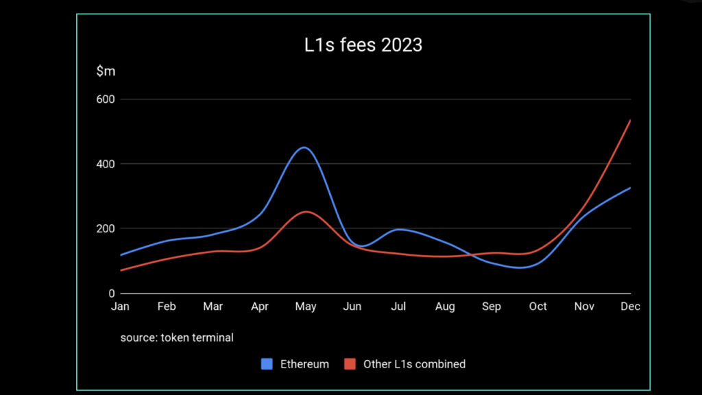 The research shows that despite a slight decline, layer one (L1) blockchains continued to dominate the fee market, accounting for 59% of all fees, up from 48% in 2022. Ethereum, which maintained its position as the market leader, showed a notable see growth. 44% decrease in rates, partly due to the migration of activities to L2 networks.