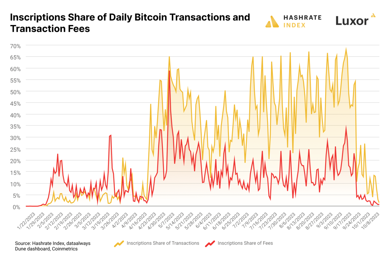 As indicated above, the decline in fees coincided with the steady decline in the number of Ordinals-related transactions. Last quarter’s gains were boosted by the explosive spike in such transactions in early May. However, since then there has been a clear decline. Ordinals’ share of compensation even fell to the lowest level since the first quarter of October.