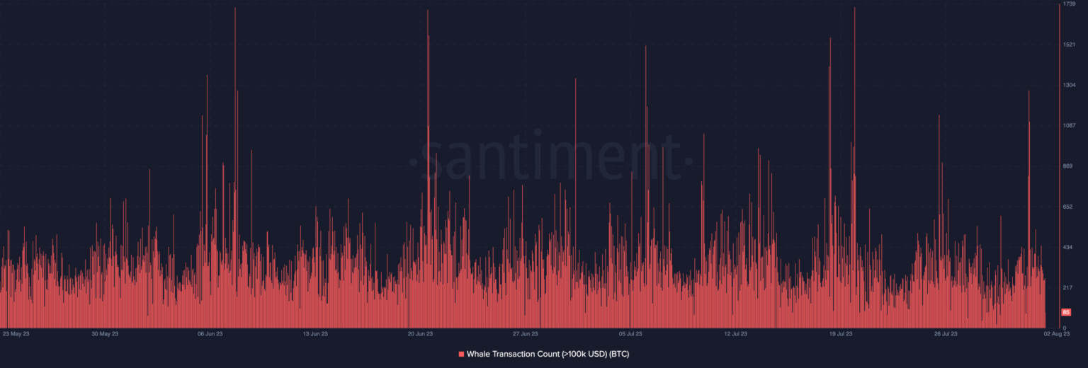 As per Santiment, BTC recorded 10,050 transactions worth more than $100,000 on August 1. This represented the highest daily count since July 26.