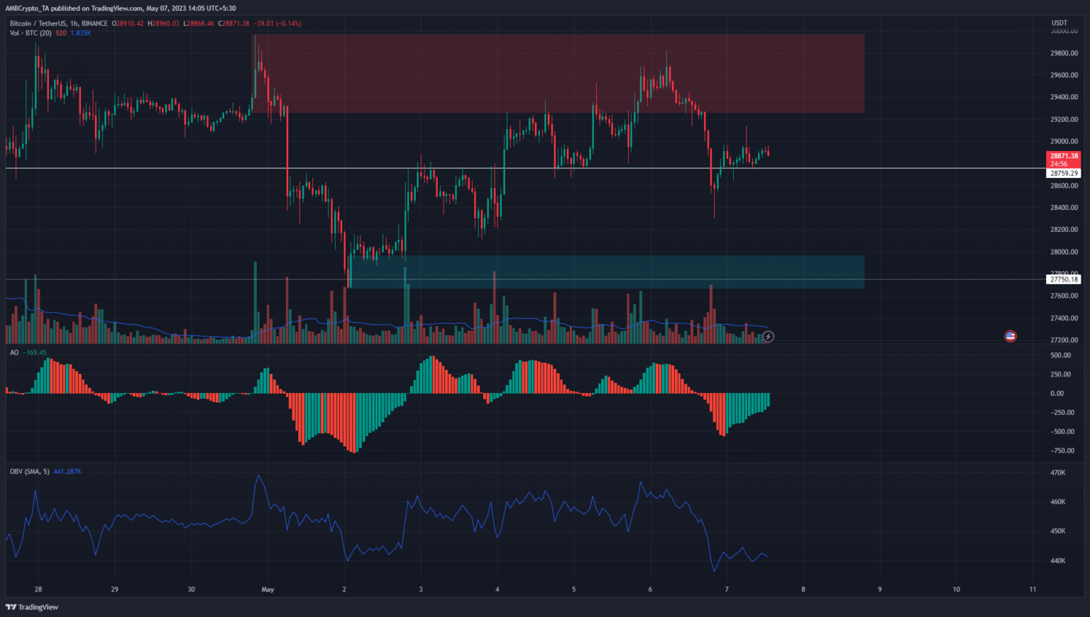 A bearish order block on the two hour chart was highlighted in red in the chart above. It was respected for the past two days as BTC bulls failed to take prices above the $29.6k level. The rejection caused BTC to drop to USD 28.6, breaking the market structure and turning it bearish.