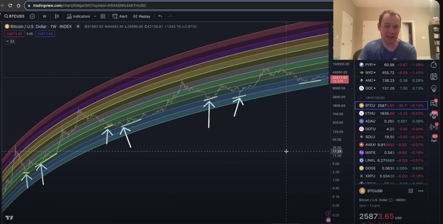 Logarithmic bands track attempts to predict the price of an asset over time by basing themselves on previous highs or lows. with different colored bands representing each price range. According to Cowen, during any bear market, the price of BTC tends to move one band lower than the previous cycle.