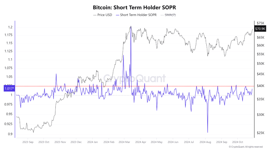 With the latest bullish push seeing BTC past the $71,000 level, the measure has seen some upside as STHs have ramped up their profit-taking. The indicator is now at 1.017.
