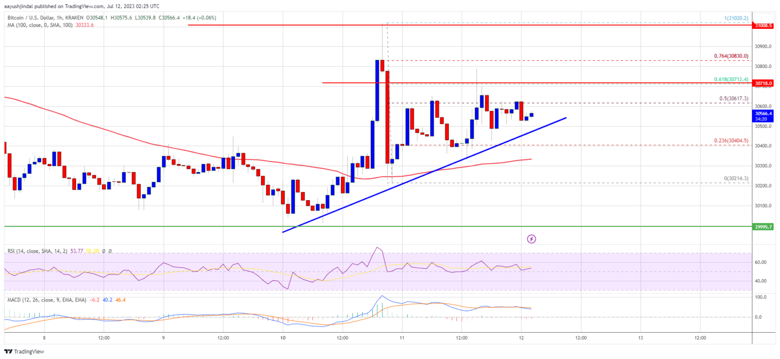 If the price of Bitcoin fails to clear the $30,700 resistance, it could trigger another decline. Immediate support on the downside is near the $30,500 level and trendline.