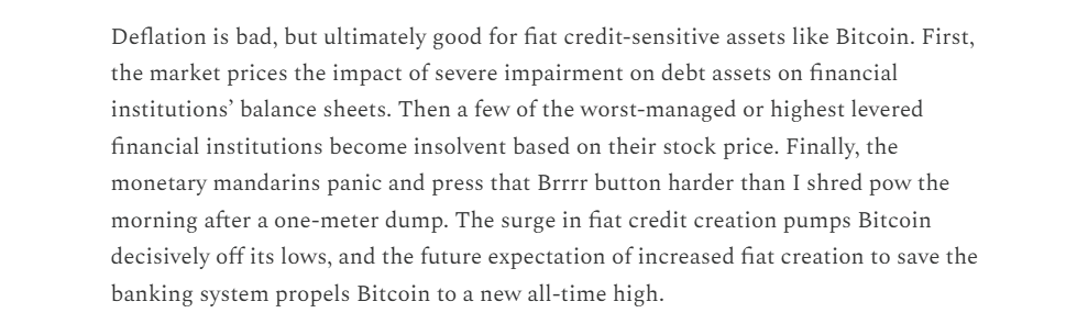 This is a dramatic chain of events: AI job losses lead to credit losses, which stresses the banks, which forces the central bank to expand the money supply, which boosts Bitcoin.