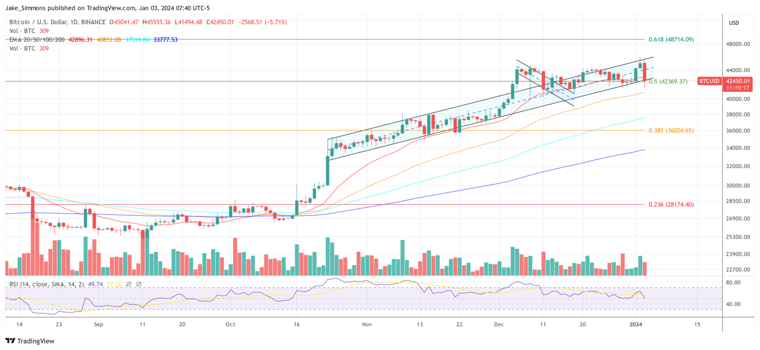 At the time of writing, BTC had already recovered some of its losses and was trading at $42,450. This means that the price has once again returned to the uptrend channel in the 1-day chart established in mid-October last year.