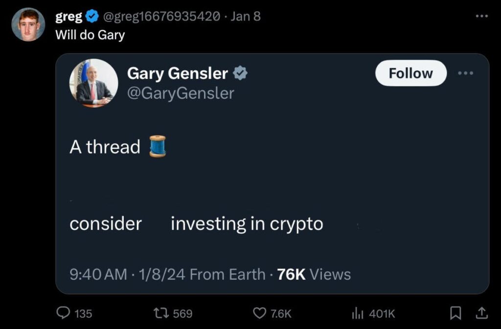 Gary posted a wire on Twitter about “Some Things to Consider When Considering Investing in Crypto Assets.” Those who read the market’s tea leaves took this as a harbinger for the public ahead of the ETF’s launch.