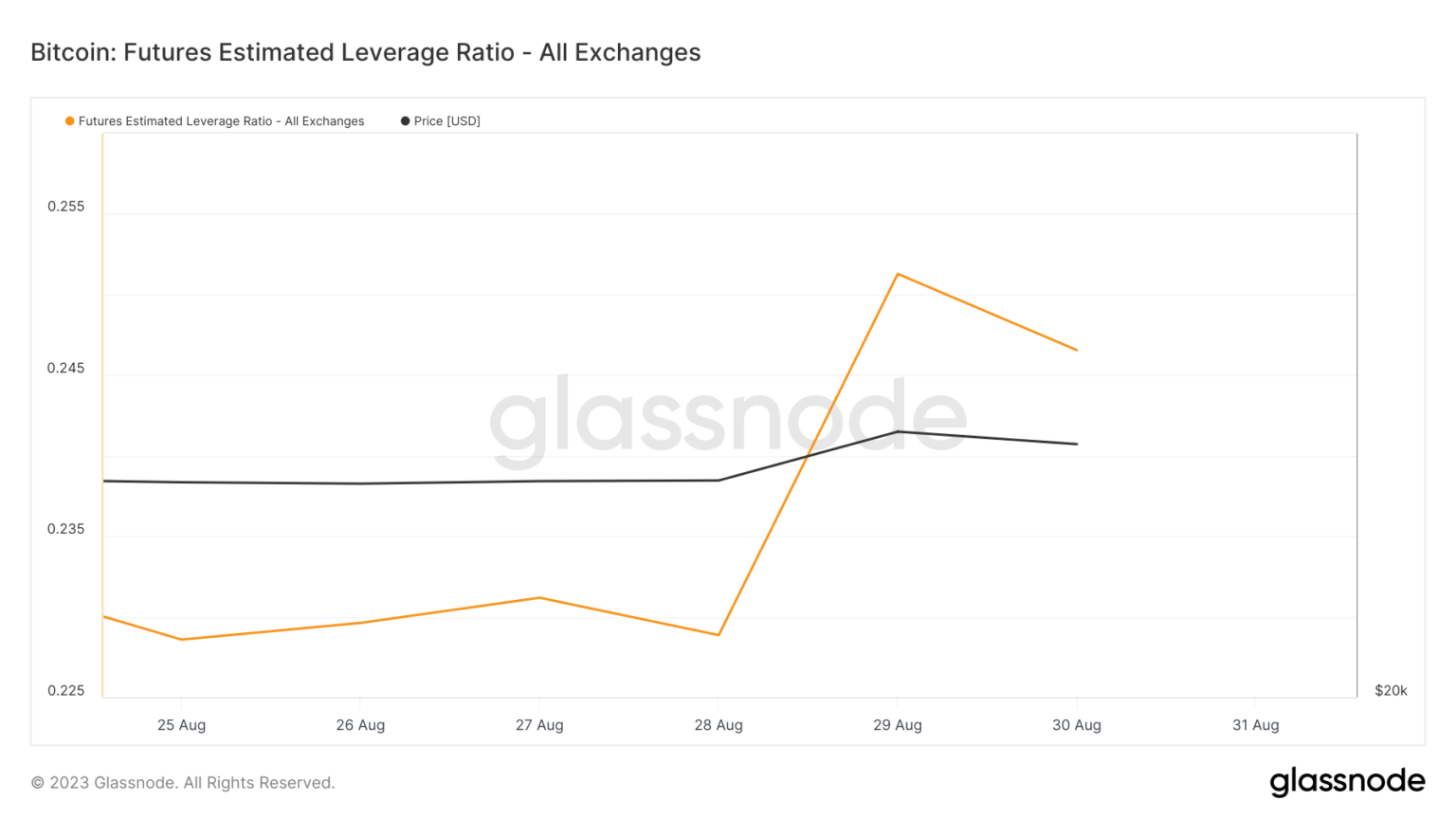 The Estimated Leverage Ratio (ELR) jumped from 0.22 to 0.25 on August 30 following Bitcoin’s jump from $26,100 to $27,700.