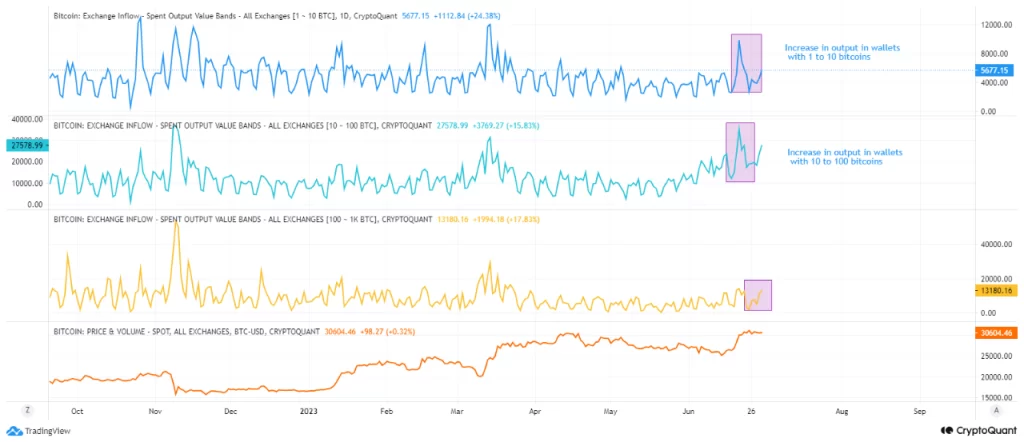 Analyst CryptoOnchain further found that the biggest increase in issued output in recent days was seen in wallets holding between 10 and 100 BTCs. The analyst noted: