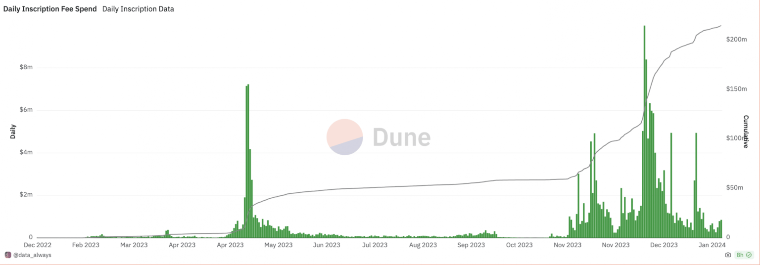 For example, on December 10, 2023, the chain recorded a per diem fee of $10 million as total transaction fees paid to mint inscriptions on the network.
