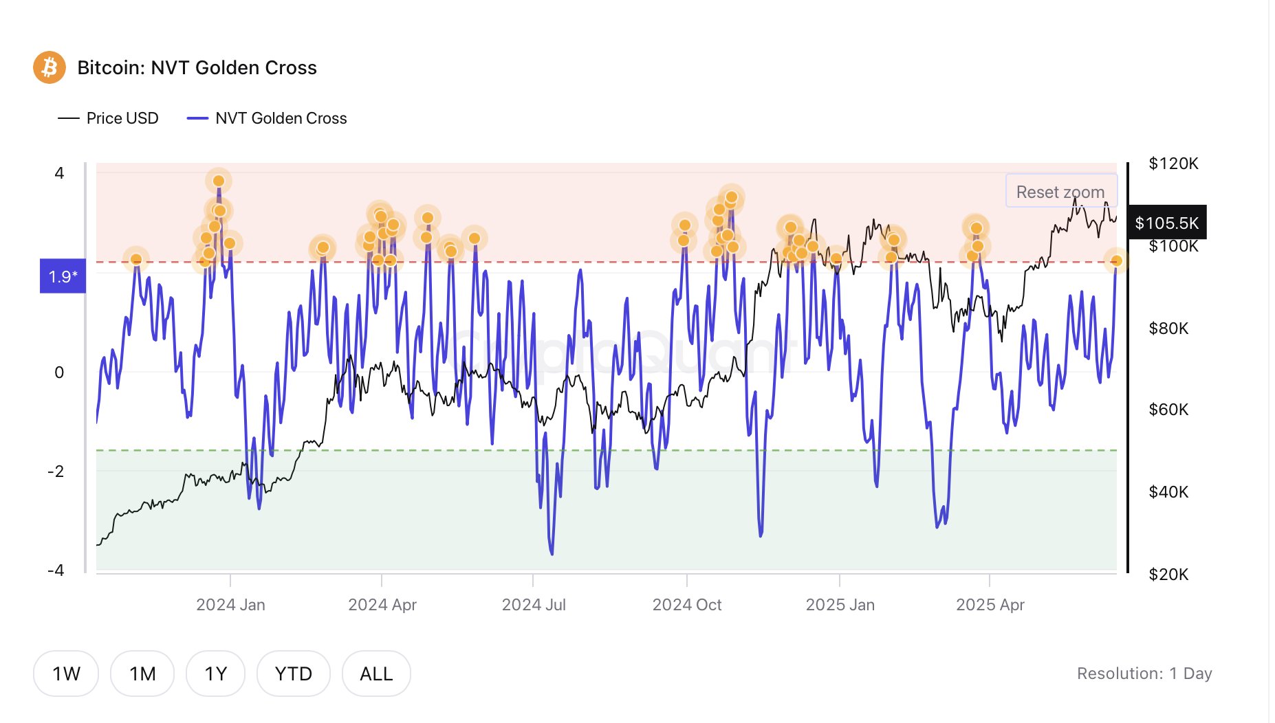 Data on the chain shows the Bitcoin network value for transactions (NVT) Golden Cross has risen in a zone that has indicated historically too expensive conditions for it.
