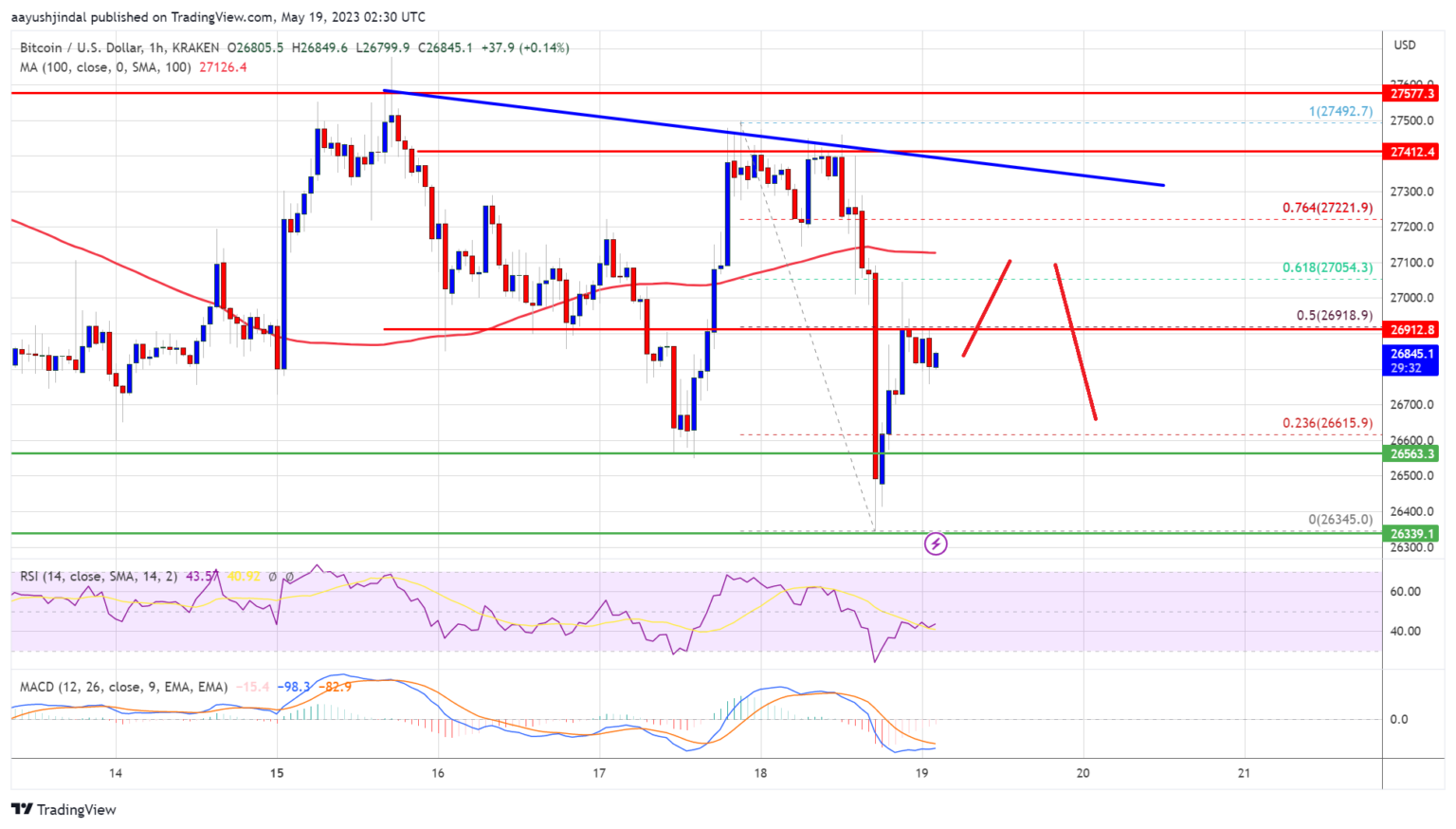 A low is formed near USD 26,345 and the price is now attempting a rise again. There was a move above the 23.6% Fib retracement level from the recent drop from the $27,492 swing high to the $26,345 low. It is now trading below $27,200 and the 100 Simple hourly moving average.