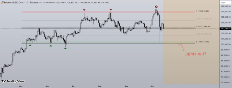 This wick refers to the flash crash wick that was set last Friday, when the Bitcoin price fell to $102,000. The market continues to struggle to recover of the last crash, even when Bitcoin was above $110,000, and another breakdown towards $102,000 could be catastrophic for altcoins.