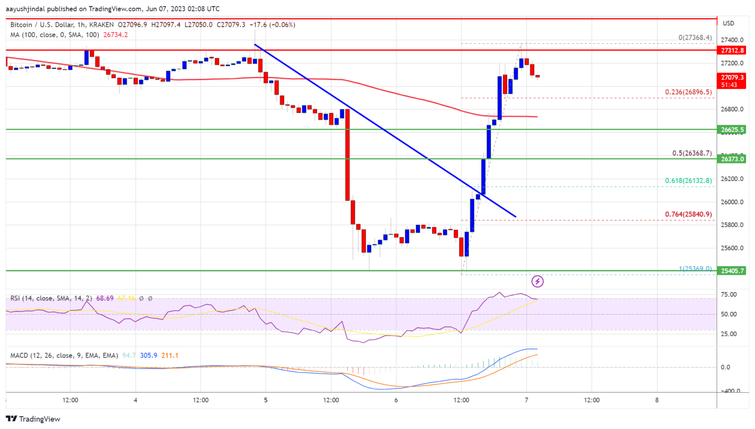 A high is formed near $27,368 and the price is now consolidating gains. It is trading above the 23.6% Fib retracement level from the recent rise from $25,369 swing low to $27,368 high.