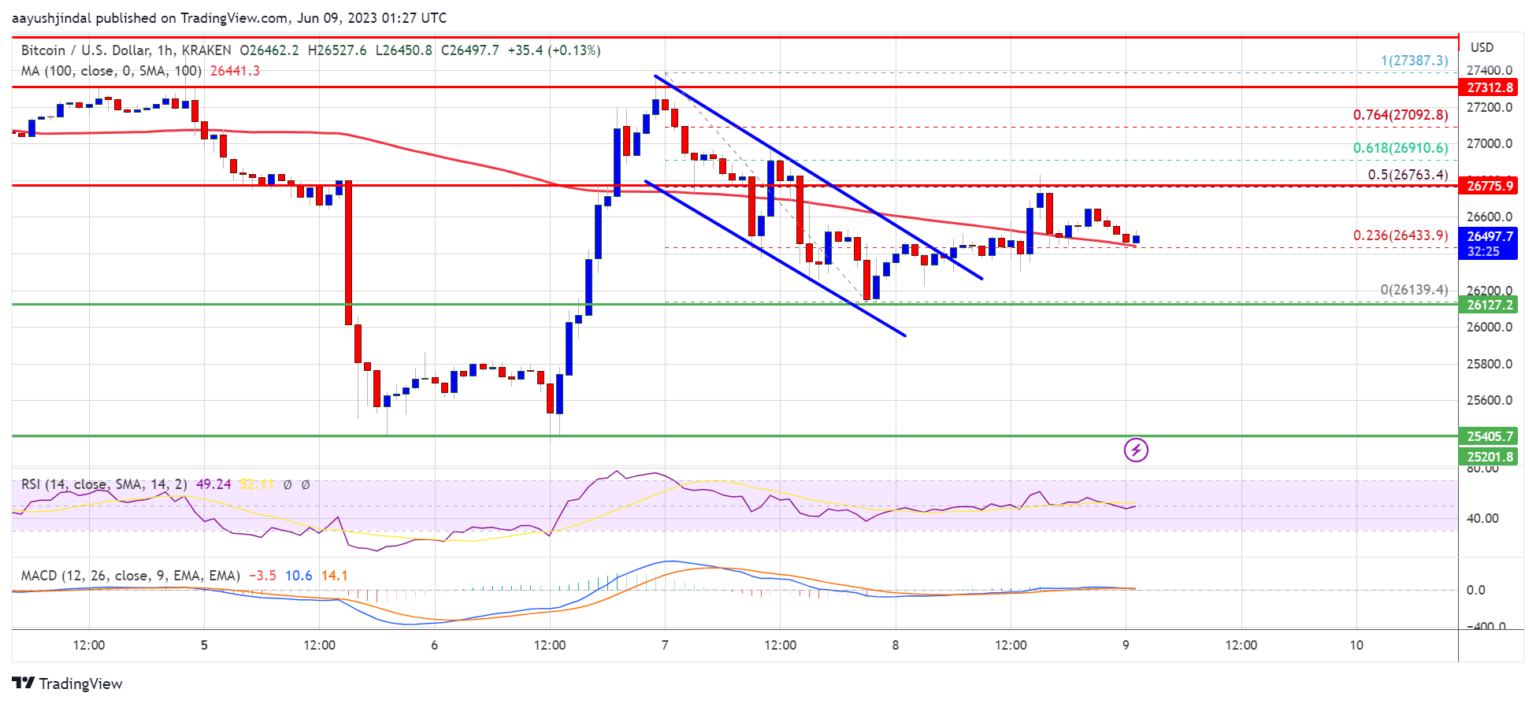 Bitcoin price is now trading near $26,500 and the 100 simple hourly moving average. It appears to be encountering resistance near the $26,750 level. It is close to the 50% Fib retracement level of the downward move from the $27,387 swing high to the $26,139 low.