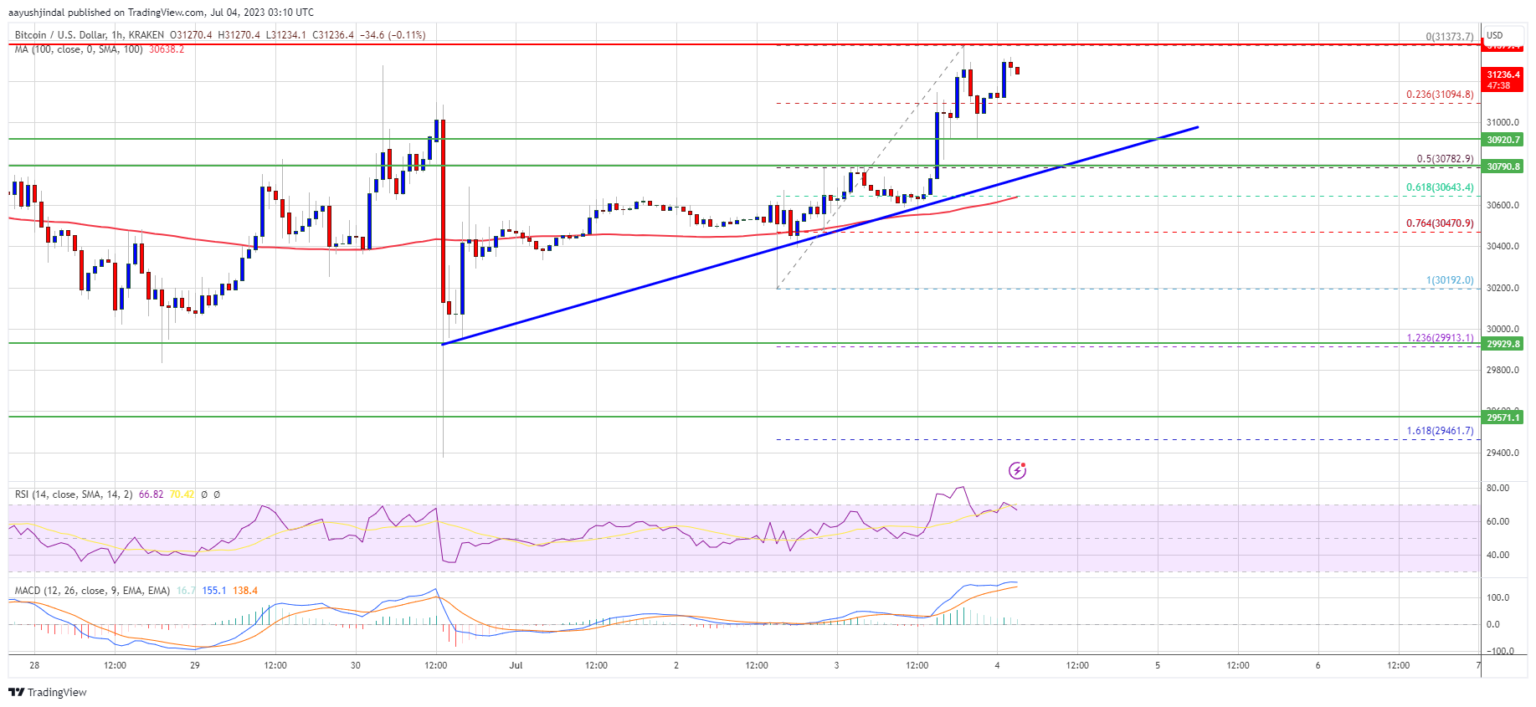 The price even broke the $31,000 zone and retested the $31,400 resistance zone. A high is formed near $31,373 and the price is now consolidating gains. It is trading above the 23.6% Fib retracement level from its recent rise from the $30,192 swing low to the $31,373 high.