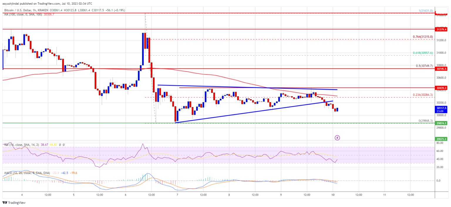 The price appears to be trading in a range above the $29,850 support zone. There was movement above the 23.6% Fib retracement level of the downward move from the $31,630 swing high to the $29,868 low. The price even attempted another increase above the $30,500 resistance, but failed.