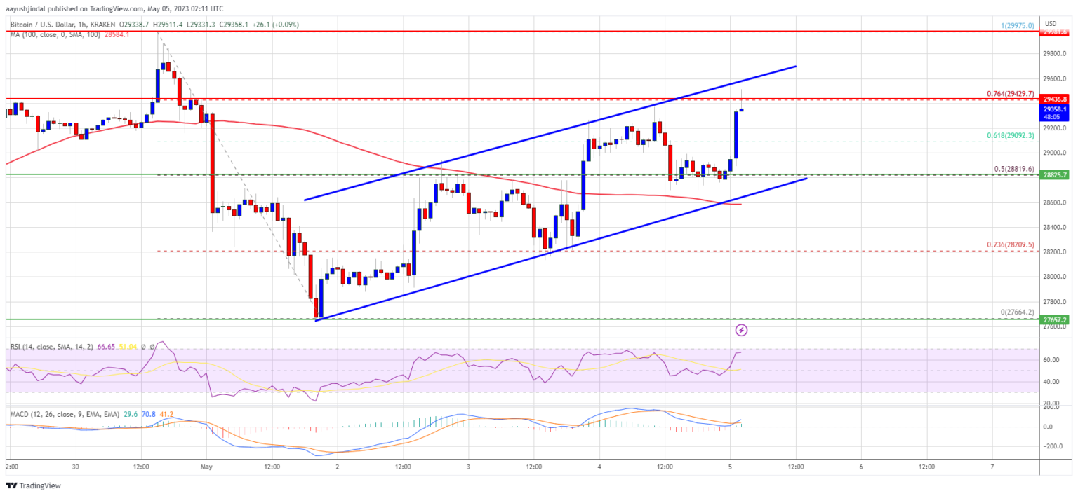 Bitcoin is now trading above $28,800 and the 100 simple hourly moving average. A major ascending channel is also forming with resistance near USD 29,600 on the hourly chart of the BTC/USD pair.