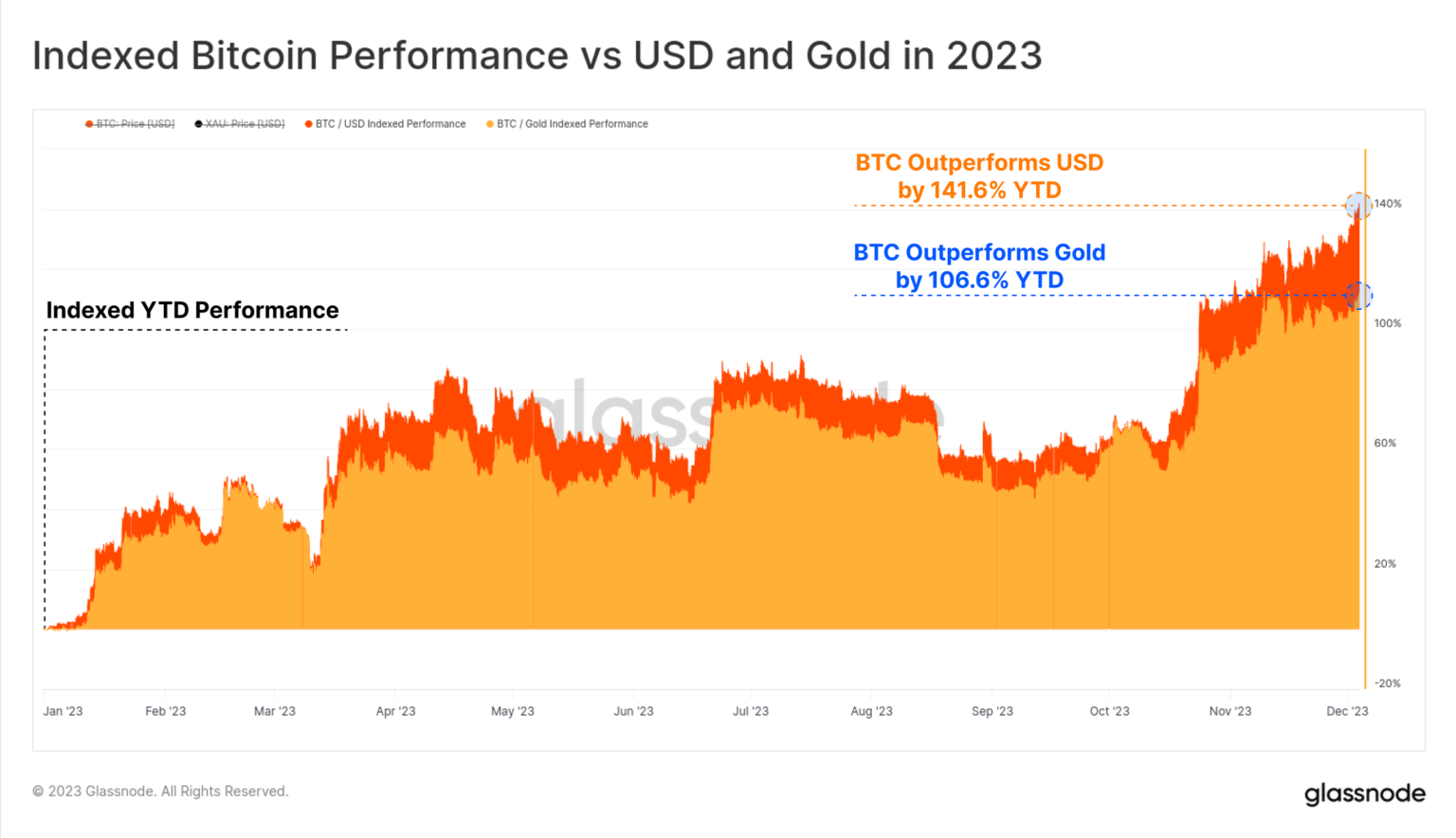King coin Bitcoin [BTC] has retained its position as one of the best performing assets globally in 2023, surpassing traditional assets such as gold and equities, Glassnode found in a new report.