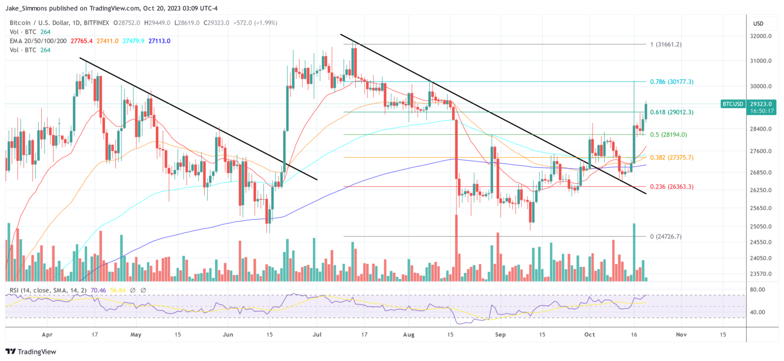 At the time of writing, BTC saw a slight retracement and traded at $29,233.