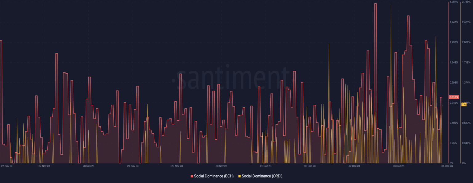 It is also important to note that ORDI’s rise to $42.25 means it has hit a new All-Time High (ATH). In terms of social dominance, data from Santiment analyzed from AMBCrypto showed that ORDI and BCH increased.