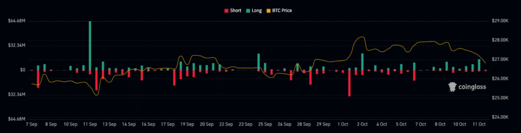- Long positions outweighed shorts despite BTC falling below $27,000.