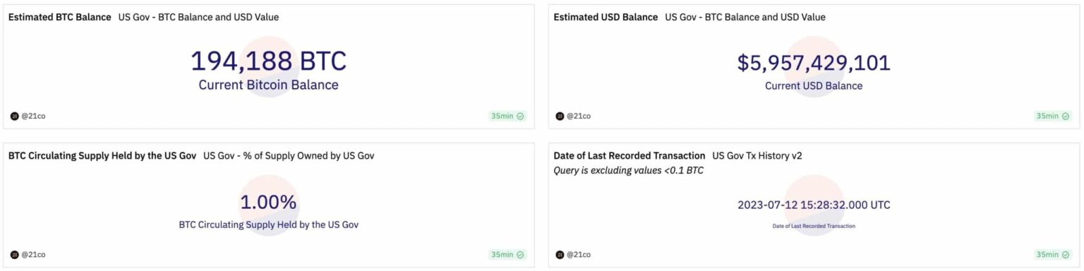 As of today, the United States government holds an estimated Bitcoin balance of 194,188 BTC, worth approximately $5.96 billion. This amount accounts for about 1% of Bitcoin’s circulating supply.