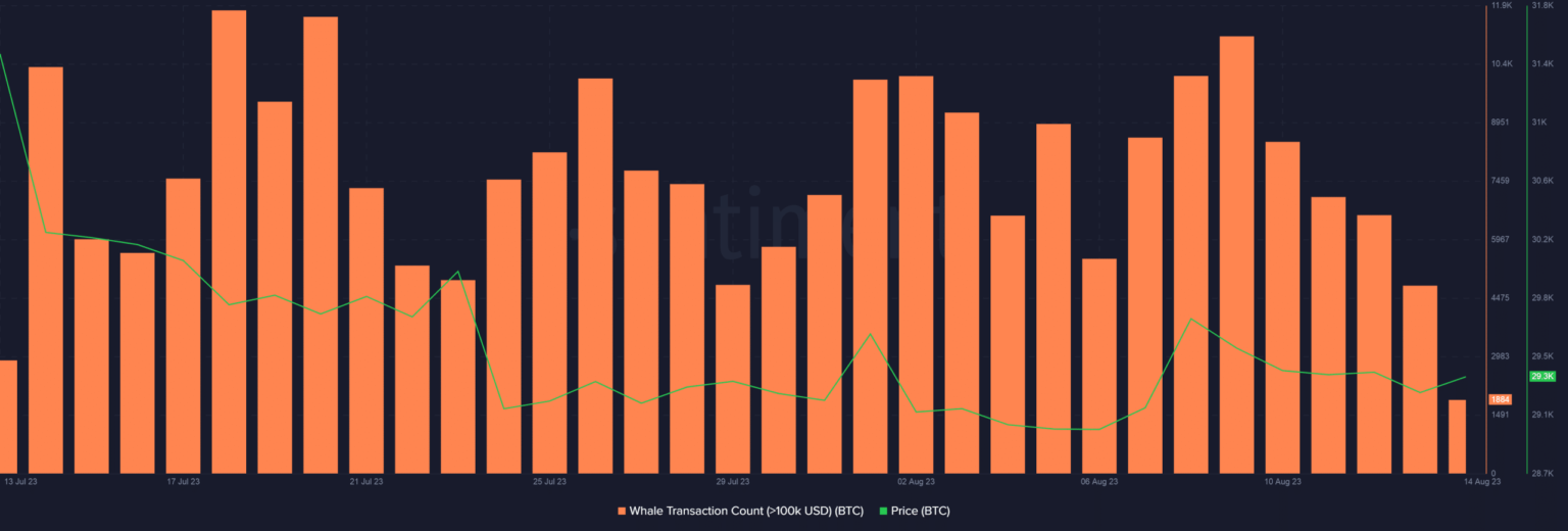 The price of BTC has stagnated in recent weeks, and during such times of inactivity, whale investors strategically turn to accumulation. Whale transactions hit a three-week high earlier this week, according to data from Santiment.